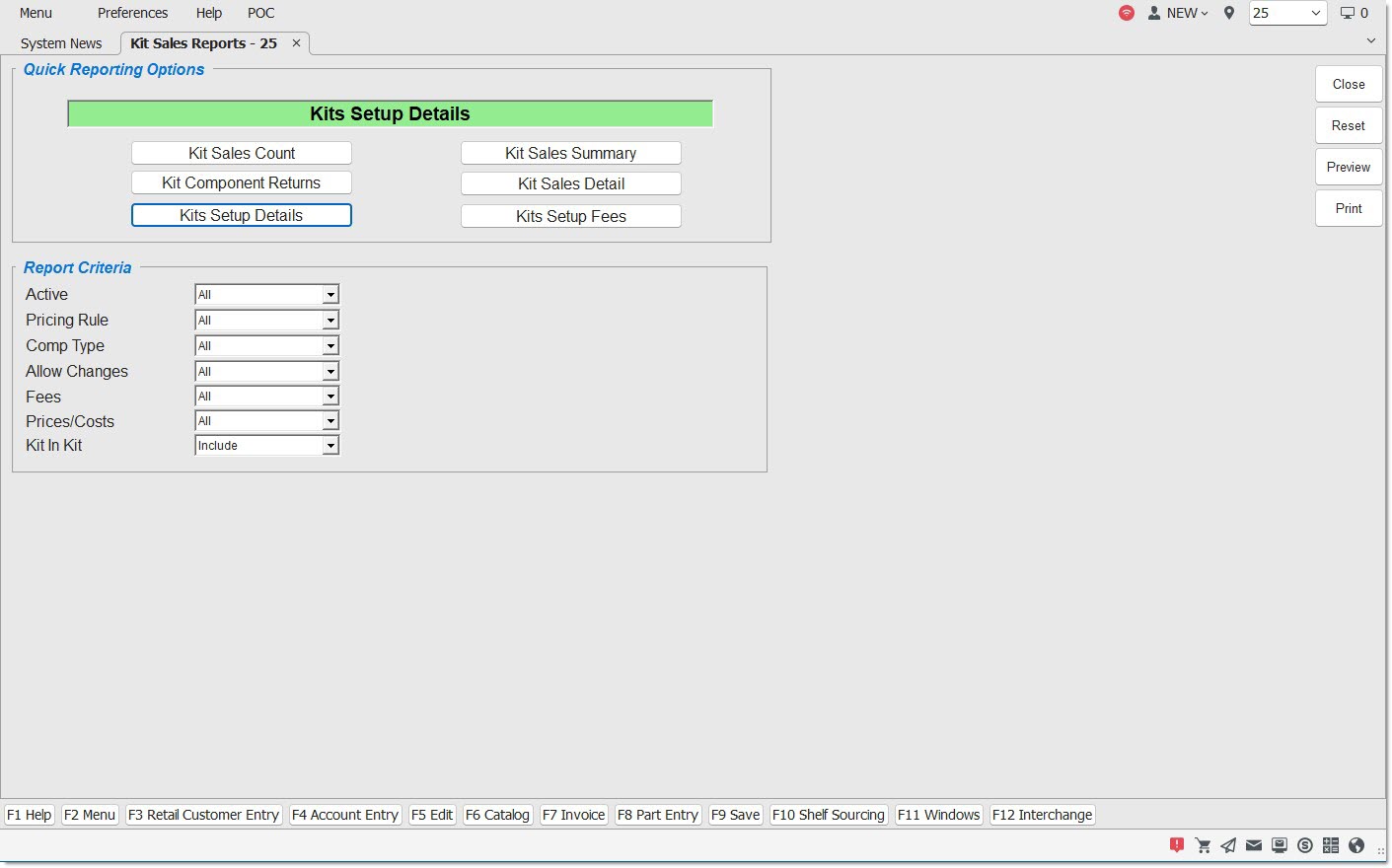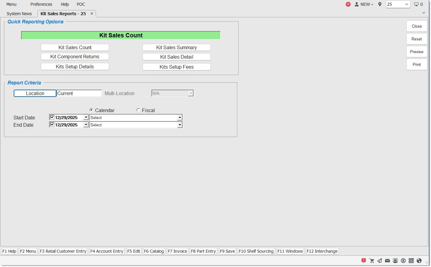 The four sales reports on the Kit Sales Reports screen provide the ability to view a count of kit sales, kit sales totals, kit sales details, and a kit component part return total, for all kits sold within a reporting period within a store location or across all store locations.
