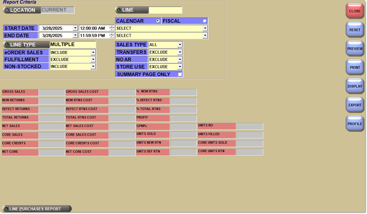 Menu Path: Reports, Financial, Line Sales, Line Sales Report screen