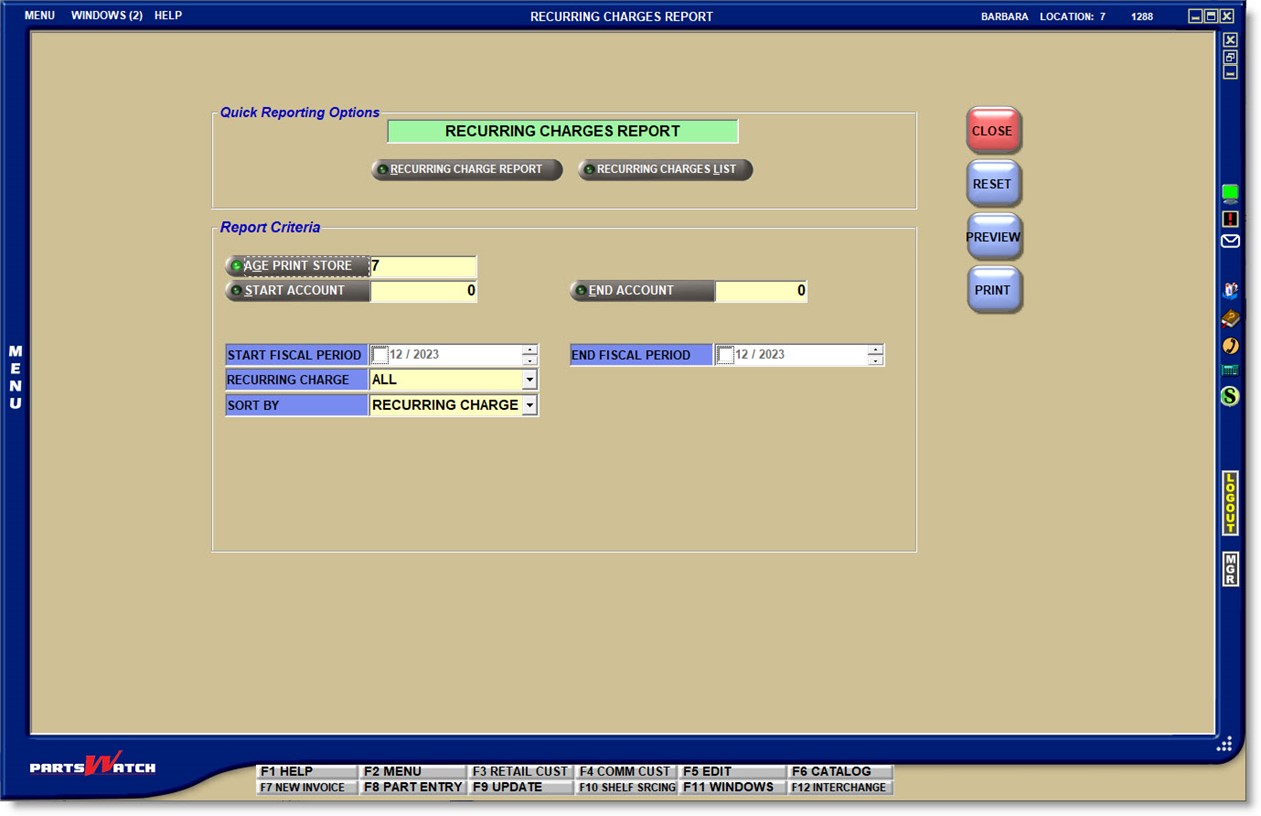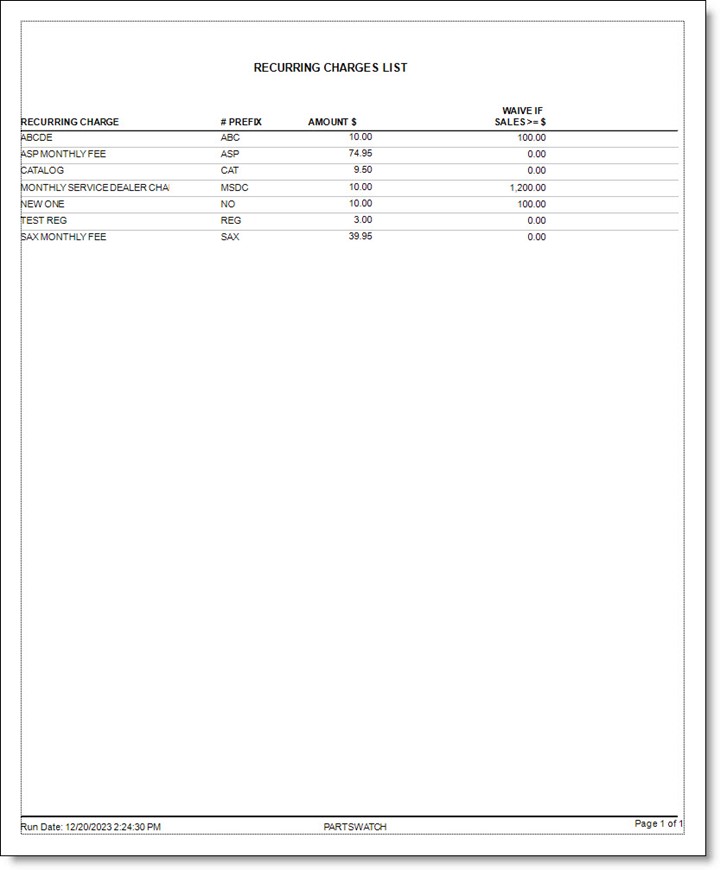 The RECURRING CHARGES REPORT screen can also be opened from the RECURRING CHARGE SETUP screen.