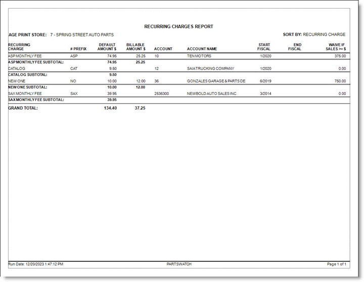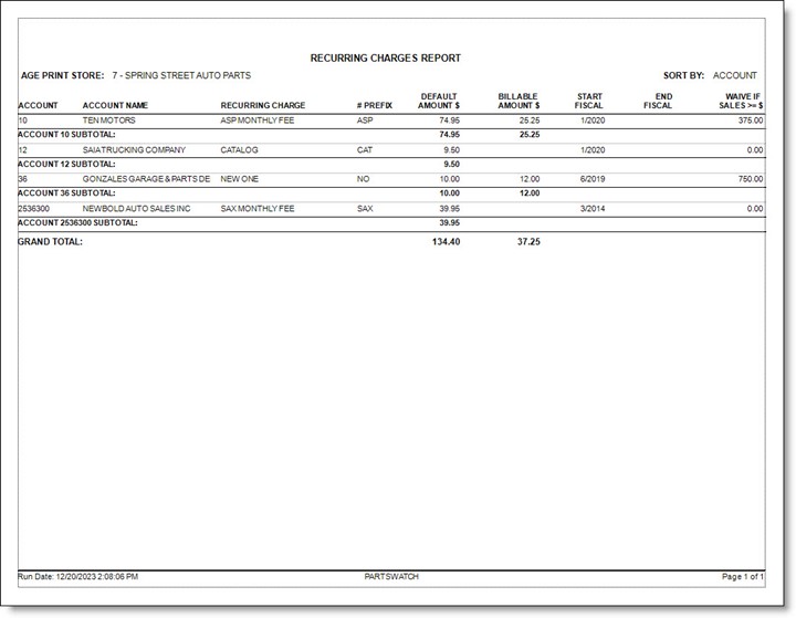 The report will display the subtotal of 'DEFAULT AMOUNT $' and 'BILLABLE AMOUNT $' by Recurring Charge or Account depending on the 'SORT BY' selected.