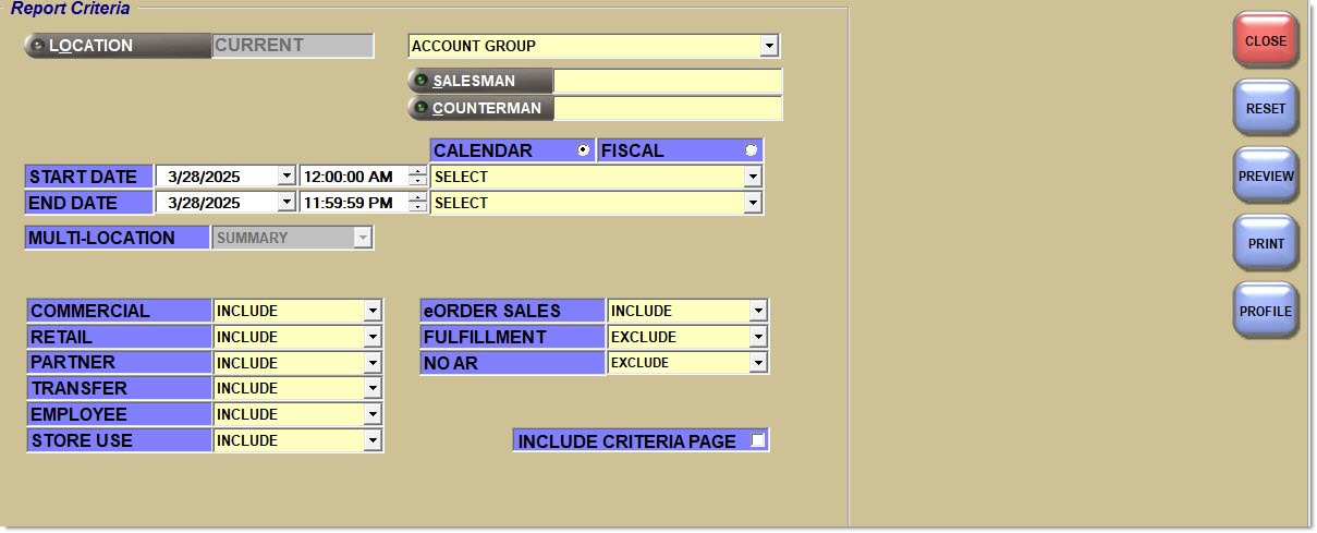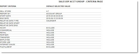 The following is an example of the multi-location 'Sales By Account Group Report - Criteria Page'.