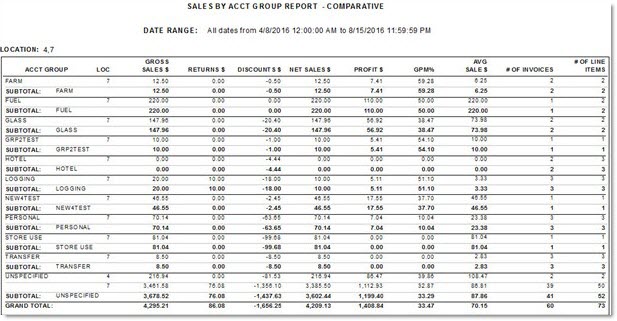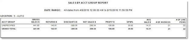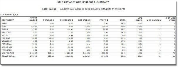 The following is an example of the single location 'Sales By Account Group Report' when run with 'Account Group' selected: