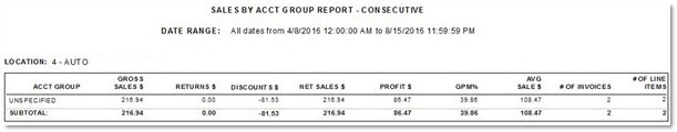 The following is an example of the multi-location 'Sales By Account Group Report - Consecutive'.