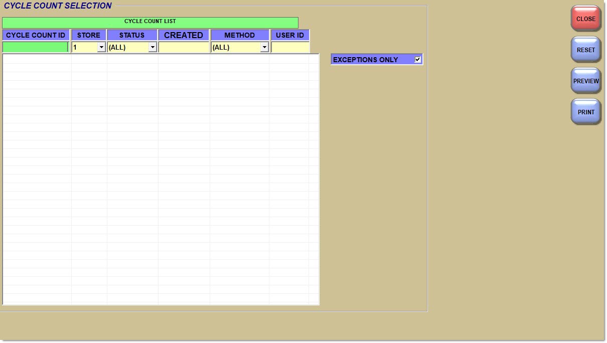 The Cycle Cont Report screen displays a summary list of all cycle counts that are maintained within the cycle count database and is used to generate a Cycle Count Report. Cycle counts can be printed without being previously printed from the PDA. Access to the Cycle Count Report screen is determined by User Security.