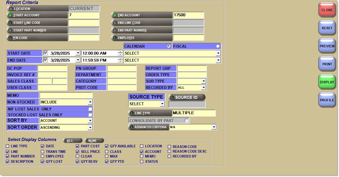 When unchecked, the 'Qty Avail' and 'Qty Resvd' columns represent the quantities at the time the lost sale was recorded. When unchecked and when 'Sort By' is set to 'Line/Part' and 'Consolidate By Part' is checked, the resulting report is sorted by Line, Part, then Date. Parts are not consolidated into one row. Each occurrence is reported on its own row.
