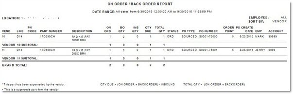 Generates the 'On Order / Back Order Report' that provides vendor purchase order related data on all parts that are on order, back order or inbound, whether sourced for a customer, the shelf or ordered through the purchasing module.