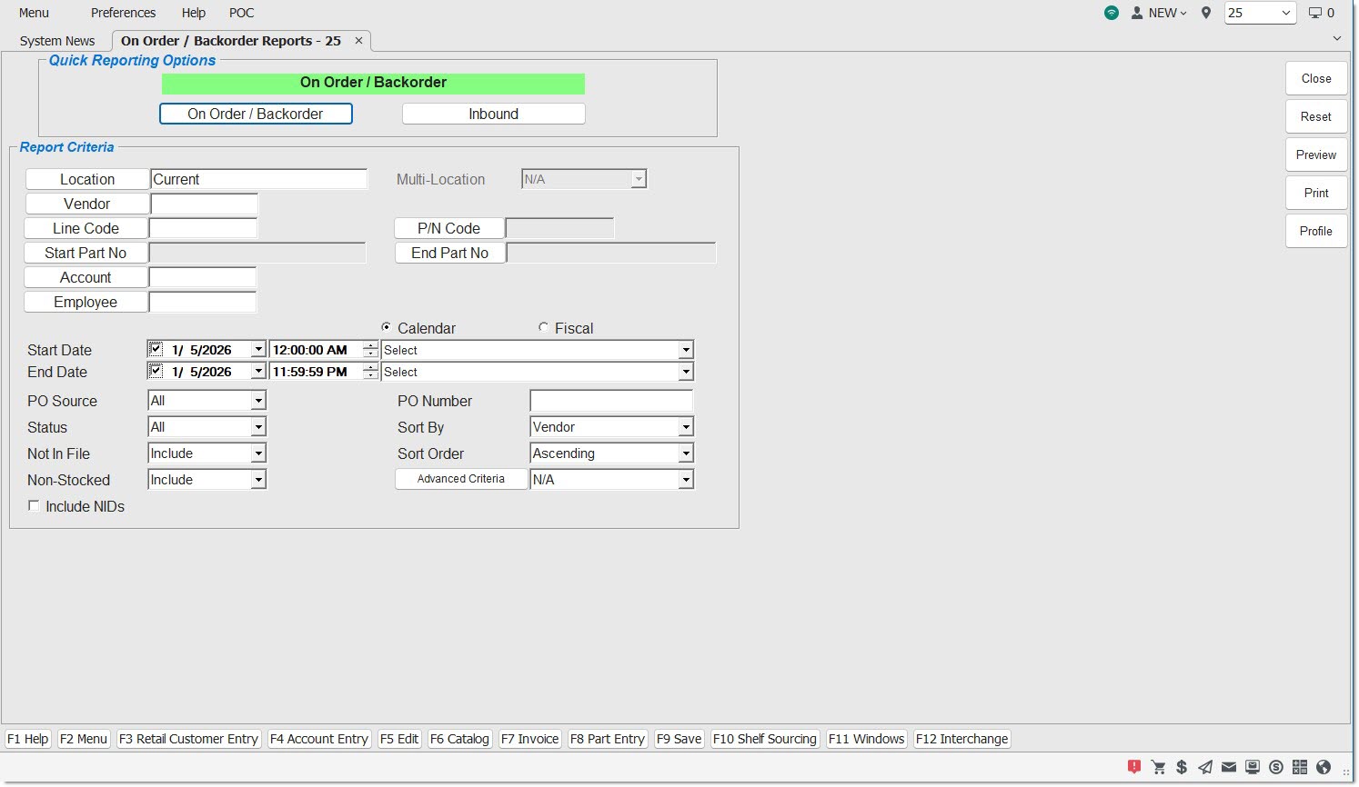 The On Order / Backorder Reports screen is used to produce the 'On Order / Back Order Report' and the 'In Bound Report' for a single location. The 'On Order / Back Order Report' provides vendor purchase order related data on all parts that are on order, back order or inbound, whether sourced for a customer, the shelf or ordered through the purchasing module. The 'In Bound Report' reports the quantities in transit (shipped but not received).