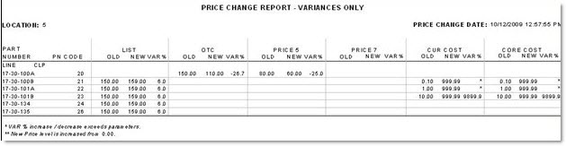 Reports all parts that have a price change or that exceed the price variance parameters as established in the Price Change Setup screen.