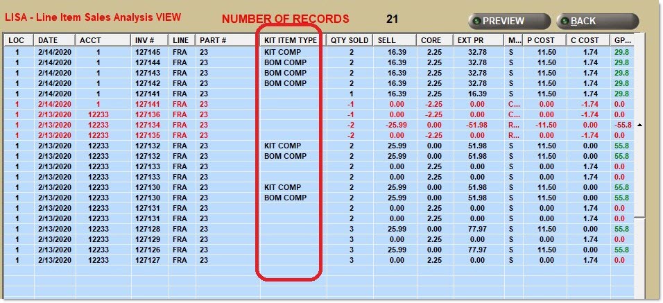When the application is displaying Kit Part Sales in the LISA Transaction Report, and the 'Display' button is clicked, if there are multiple parts with cores for a kit sale of one, the application displays a value of one for the 'Total Core Qty' at the bottom of the screen.
