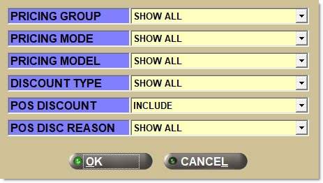 'POS Disc Reason' - Filters by a specific manual discount reason code, such as 'Price Match' or 'Vendor Discount Offer', as set up in the Reason Codes screen. Field displays blank if reason codes are not set up. Options are: