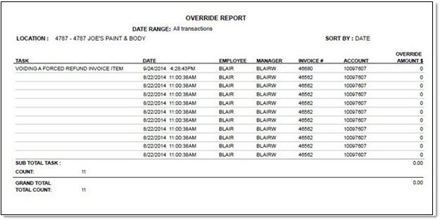 The Override Report screen is used to report users who override the business rules to force returns that do not meet predetermined rules onto a merchandise card and to finalize an invoice that needs to be scan validated. The date and time, invoice #, amount, the employee who was creating the invoice, and the overriding manager are reported.