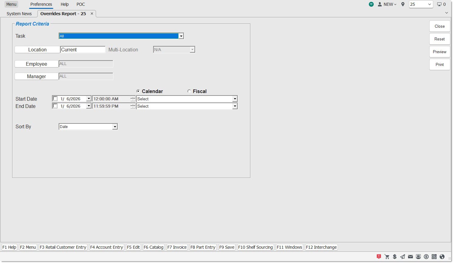 Menu Path: Reports, Override Report, Override Report screen