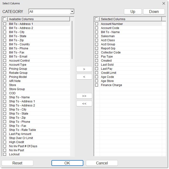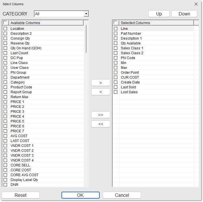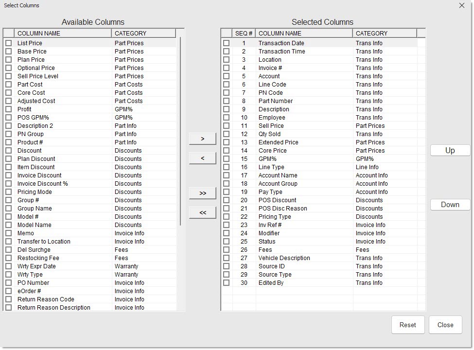 Click the 'Report Generator' button (or the 'Columns Displayed' button, depending on the screen) to display the 'Select Columns' window used to select fields to be reported. The 'Select Columns' window consists of two sections: 'Available Columns' and 'Selected Columns'. The 'Available Columns' section shows all fields not currently selected and displayed in 'Selected Columns' section. The 'Selected Columns' section shows all fields that have been selected and moved from the 'Available Columns' section. Note: User Security cost security applies.