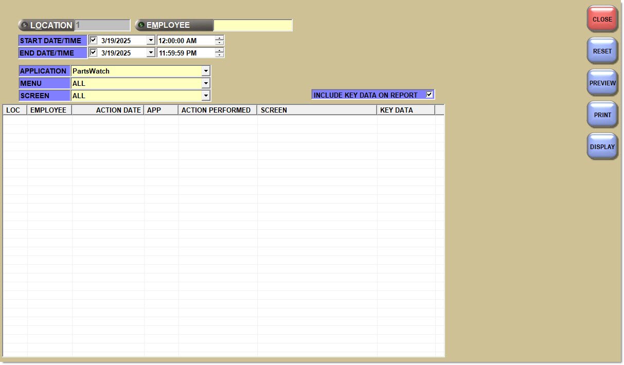 Determines whether the 'Key Data' field value displays on the report output. The 'Key Data' field value contains key information related to the item being updated. For example, in the Main Part Entry screen where a part item is being updated, the 'Key Data' field value will contain the store number, line code, and part number.