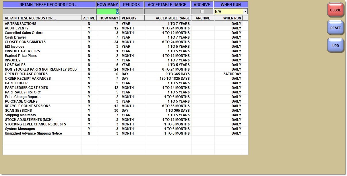 Click 'Upd' when all edits are done. The changes are saved. Qualifying records will be purged at a predetermined time.