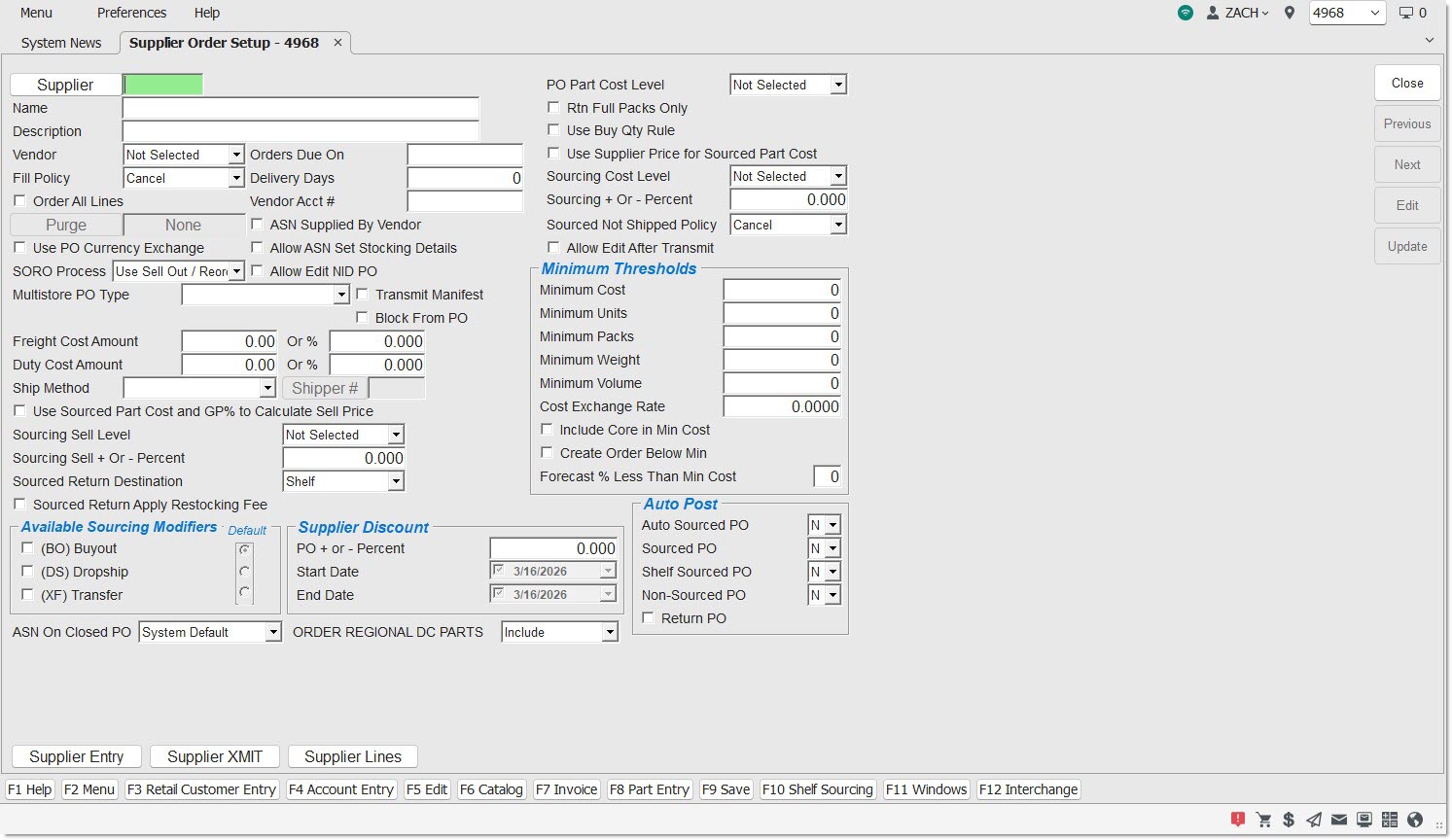 Suppliers cannot be added from this screen and if one is entered that does not exist, the system prompts to add Suppliers from the SUPPLIER ENTRY screen.
