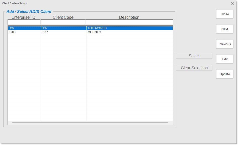 Click the button to display the 'Client System Setup' window, which is used to add, edit, delete, and select an 'ENTERPRISE ID/CLIENT CODE'.