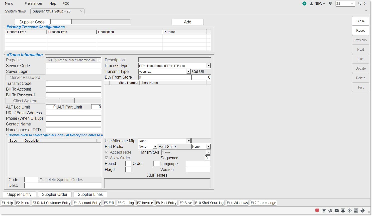 The Supplier XMIT Setup screen is used to add the transmission record information per vendor that will be used by sourcing and purchasing to send an order to another store or vendor.